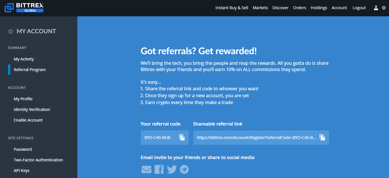 A Bittrex referral code is a code which does not currently give you anything off trading fees. But it does allow to earn 10% of your referrals fees for people you invite to Bittrex.