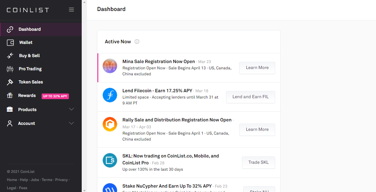 CoinList claims to be "where early adopters invest in and trade the best digital assets". They were founded in 2017 in San Francisco. They have risen to fame due to their notable pre-sales of Flow, Casper and Mina tokens.