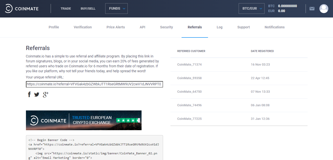 A Coinmate referral code is a code which gives you access to the Coinmate trading platform. You can then earn20% of trading fees from your own referrals, if you create an account with this link. We also get a small commission. It's a win-win.