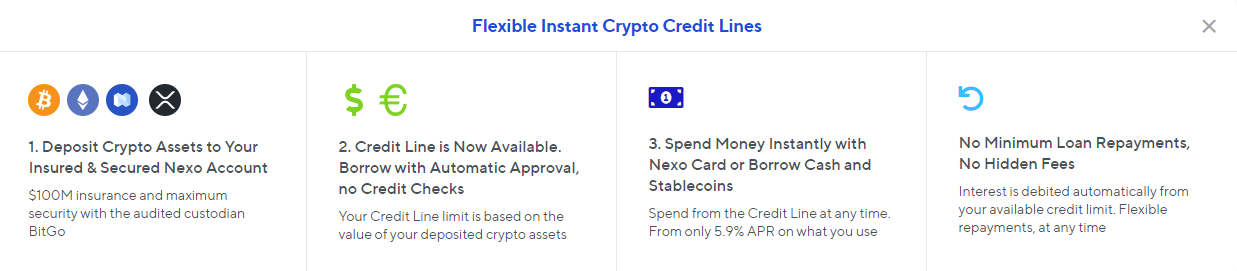 Nexo allows you to earn daily interest on your crypto and EUR, GBP and USD. All with zero and no hidden fees. Insured by BitGo for $100 million insurance on all custodial assets. EU licensed & regulated financial institution. You can also borrow cash or stablecoins collateralise your crypto and borrow instantly with Nexo's crypto credit lines.