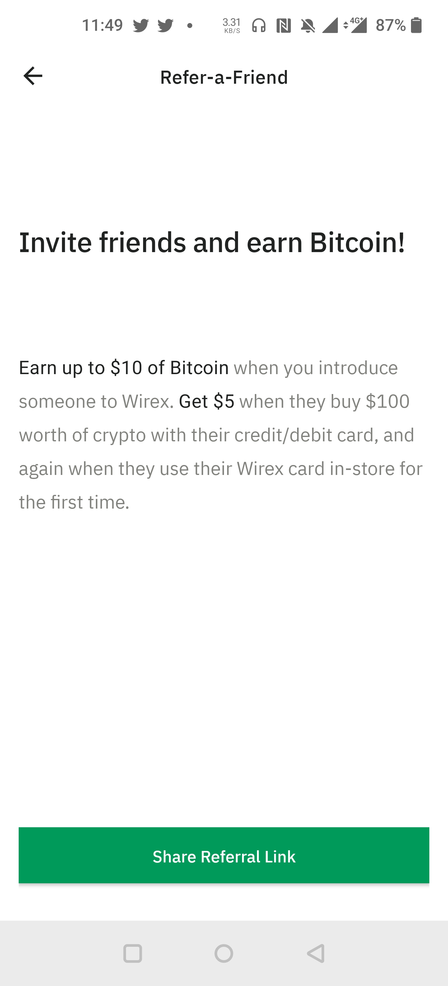 Yes, everyone who registers can benefit from the referral program. The Refer-a-Friend programme, allows you to earn up to $10 worth of Bitcoin when you introduce someone to Wirex. You will get $5 when they buy $100 worth of crypto with their credit/debit card, and then again when they use their Wirex Card in-store for the first time.